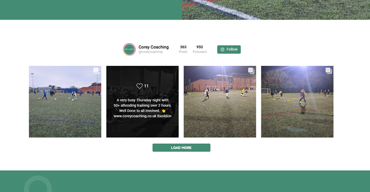 Maintain visual consistency: Ensure the social media feed integrates seamlessly with your website’s design and aesthetics. The integrated feed for the football club, Corey Coaching, shown below matches their brand font and colours, helping it to blend in with their homepage: